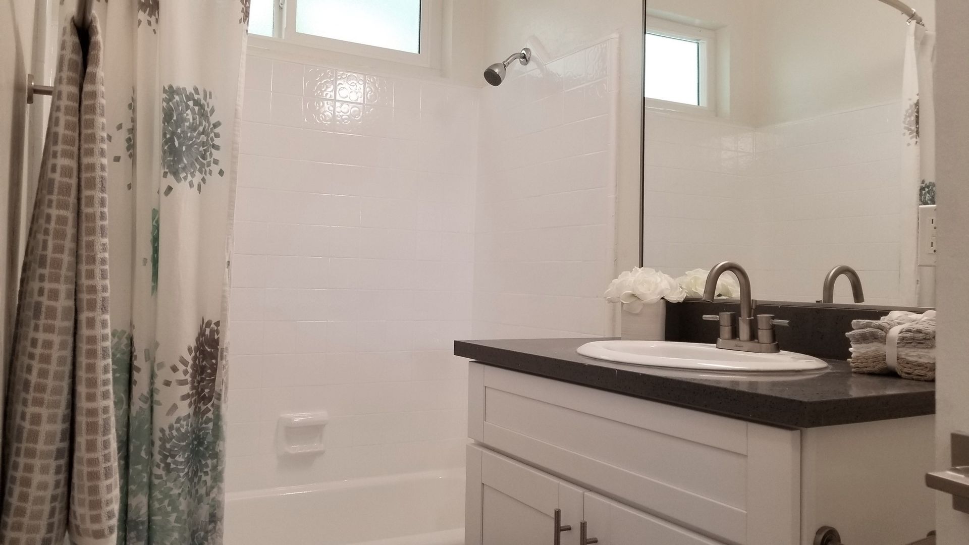 o Updated bathroom with designer vanity and refinished tub/shower combo