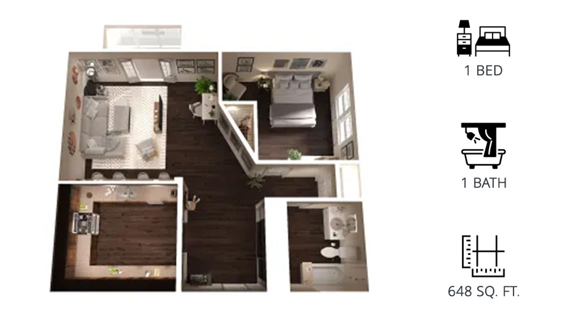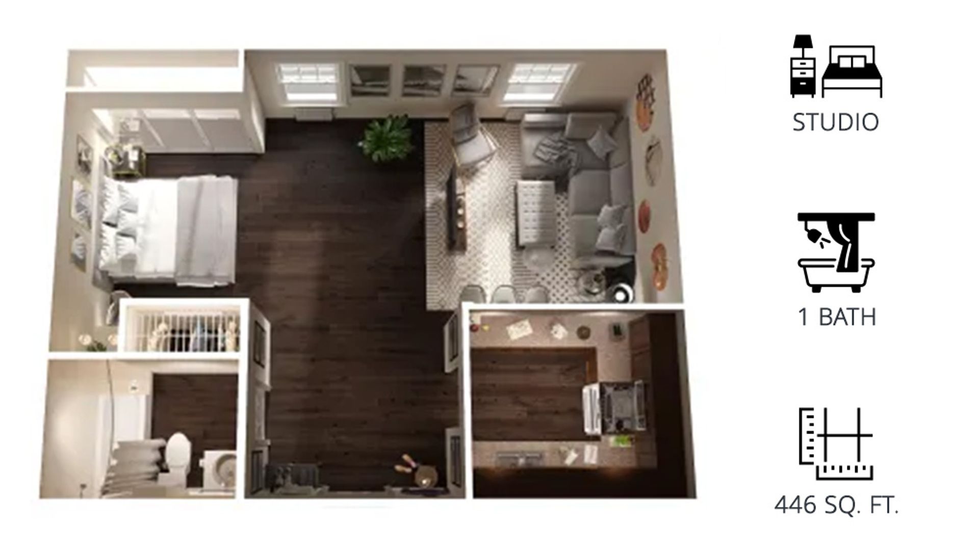 Choose from spacious studio, one-, or two-bedroom floor plans, all thoughtfully designed with features like all-electric kitchens, granite countertops, wood-style flooring, and central air conditioning—ideal for relaxing and recharging.