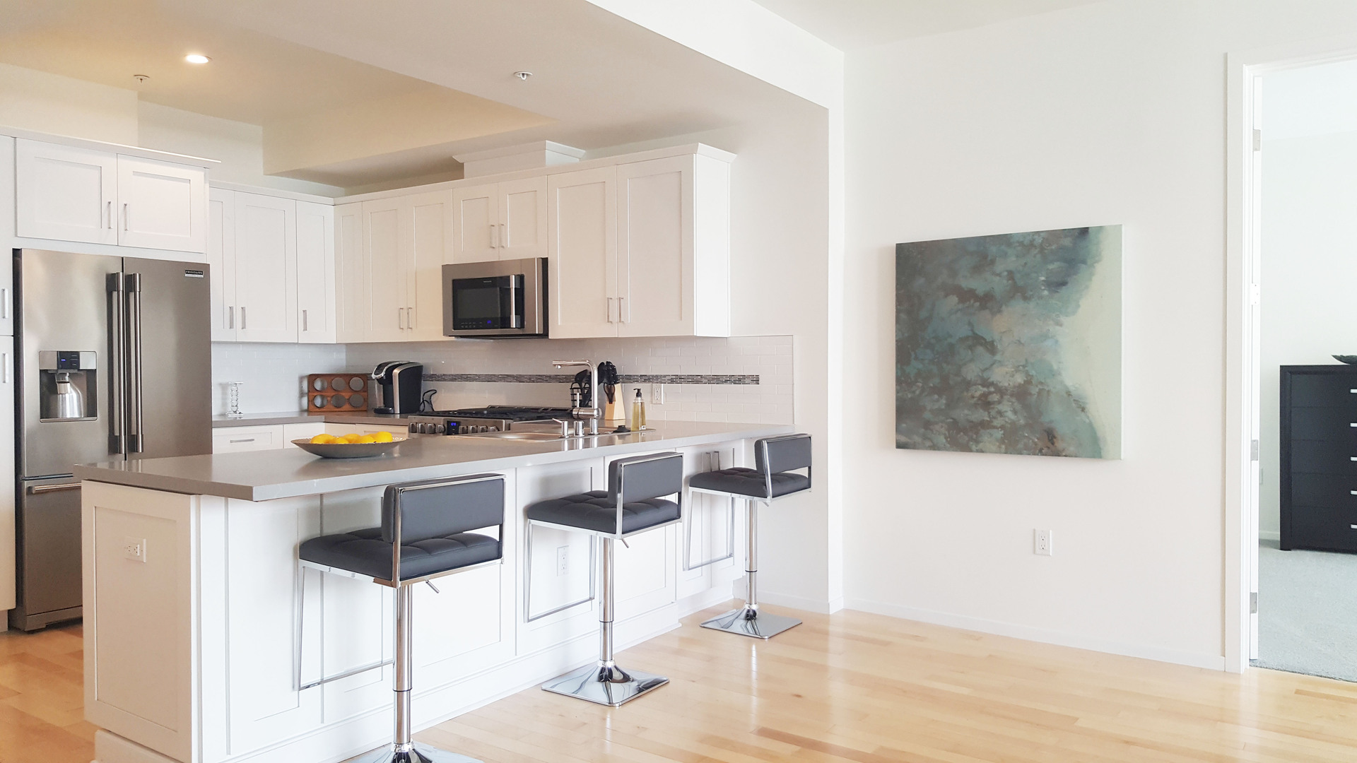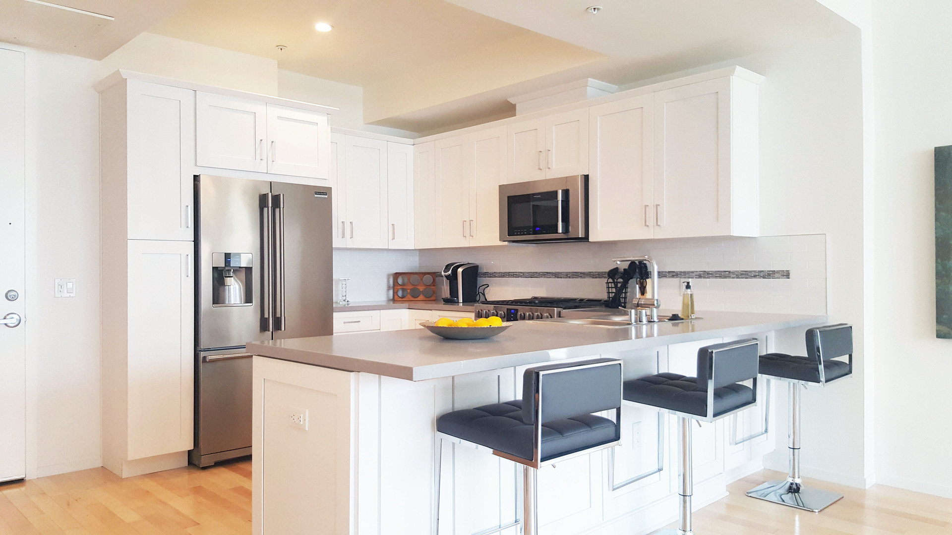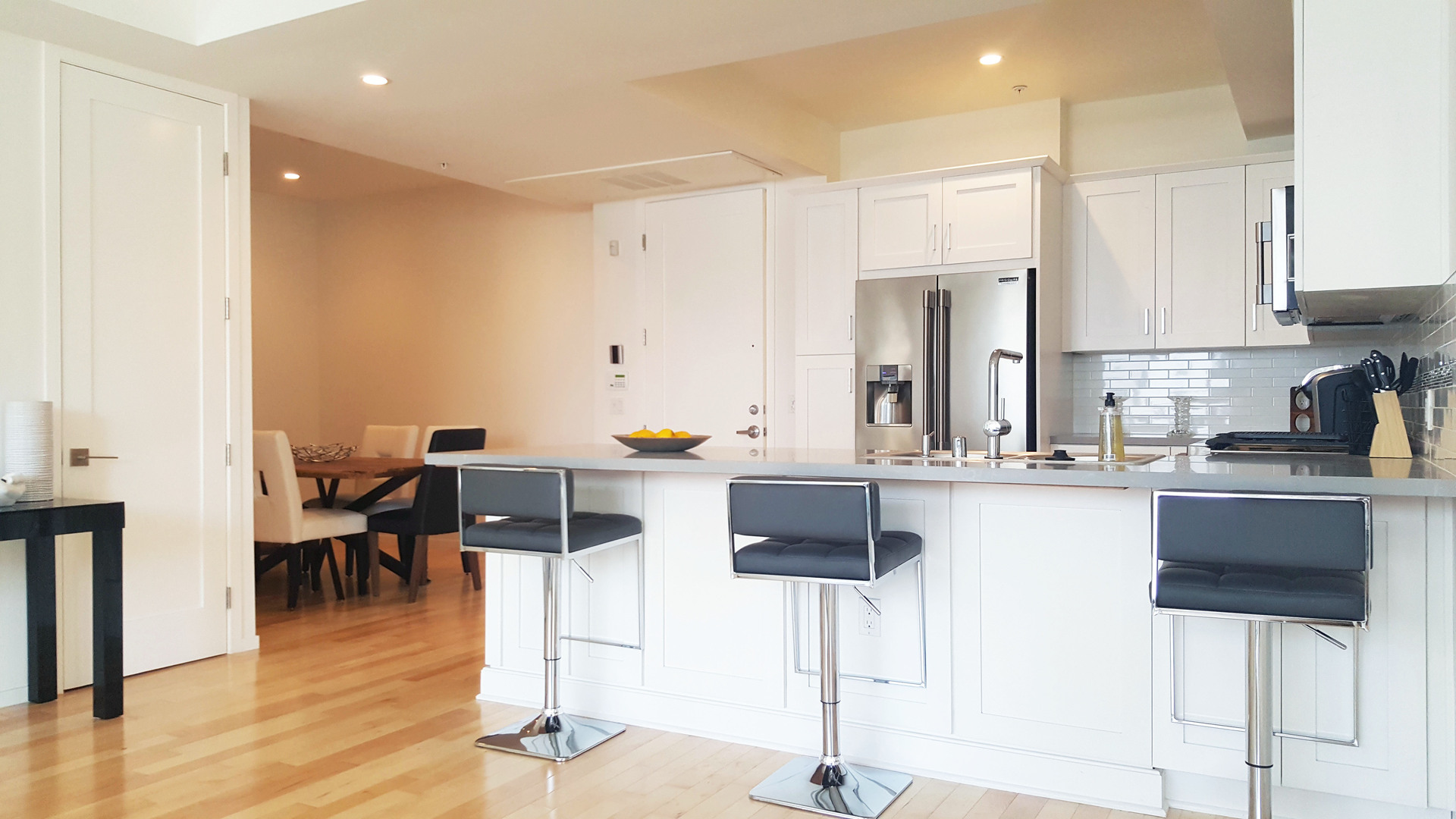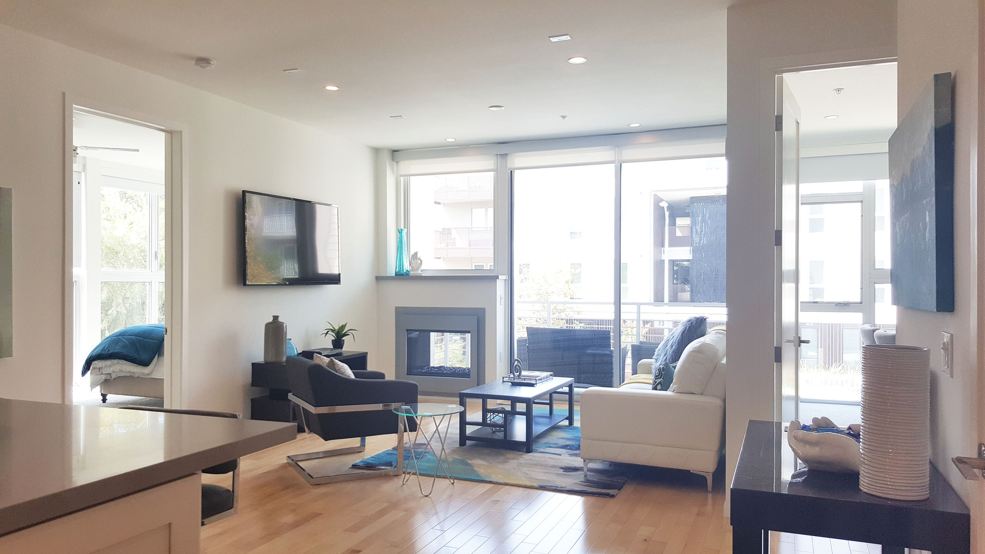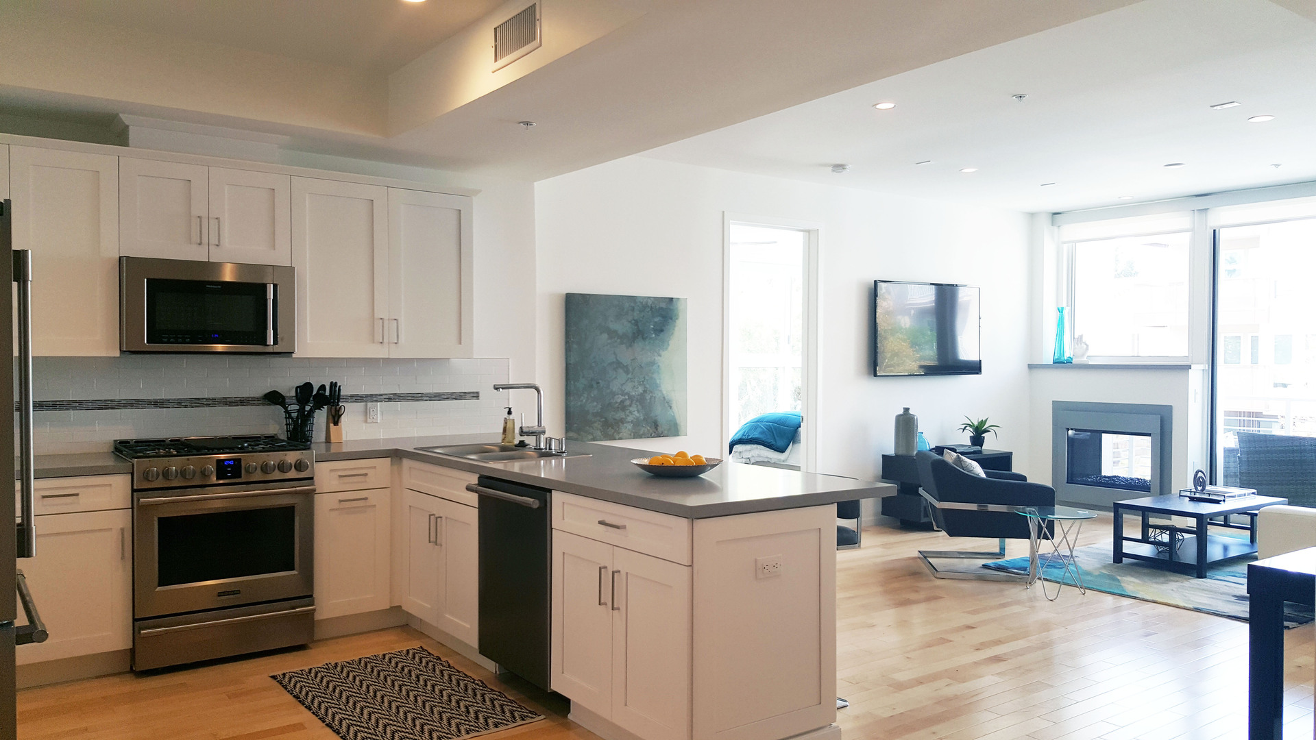 Top floor, spacious, condo-style 2bed/2bath apartment with designer touches throughout will not last long! Finishes include: Gourmet kitchen with full stainless-steel appliance package (refrigerator, dishwasher, gas stove and built-in microwave), extremely large breakfast bar, quartz counter tops in the kitchen and bathroom. The over-sized living room comes with floor-to-ceiling, wall-to-wall windows with custom blinds! A large balcony and cozy gas fireplace, viewable from inside the apartment and outside from the balcony.This home includes an in-unit stacked washer/dryer set. Each bedroom offers plush carpeting, large wall-to-wall closet in the guest bedroom and 2 closets in the master bedroom (wall-to-wall and walk-in). This home also features 9-foot ceilings with recessed lighting, central air and heat, wood flooring and other designer finishes.
