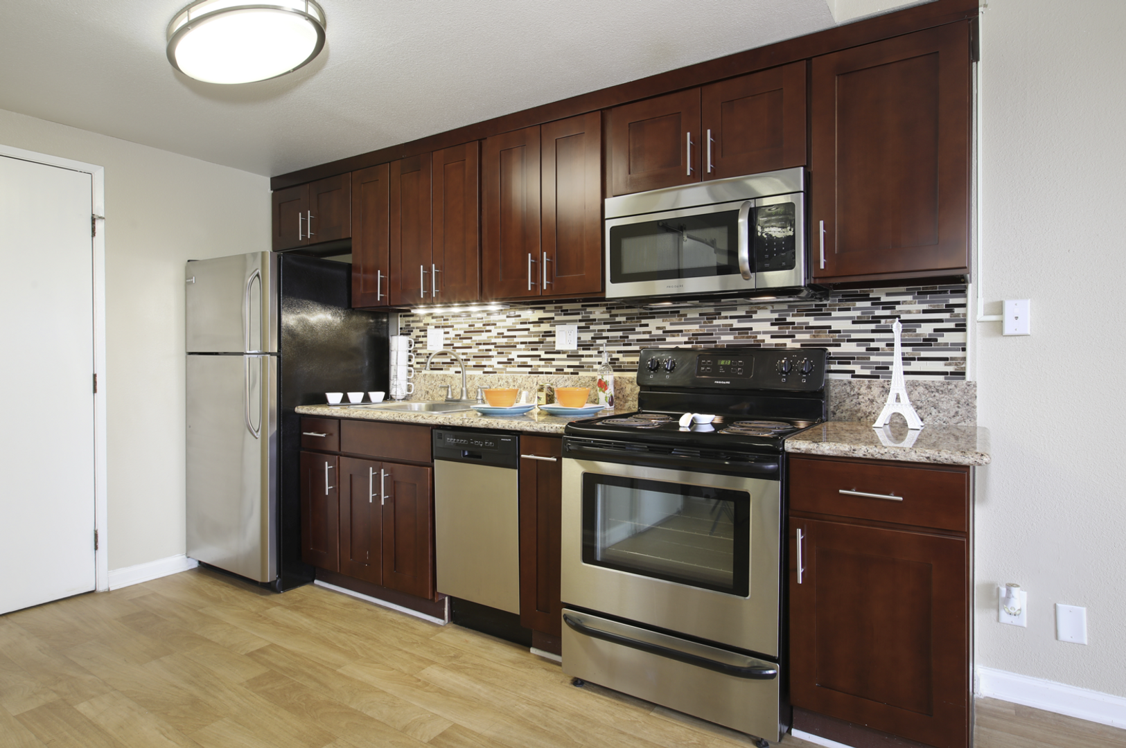 * stainless steel appliance package: dishwasher, electric stove, built-in microwave, and even a full-size refrigerator!