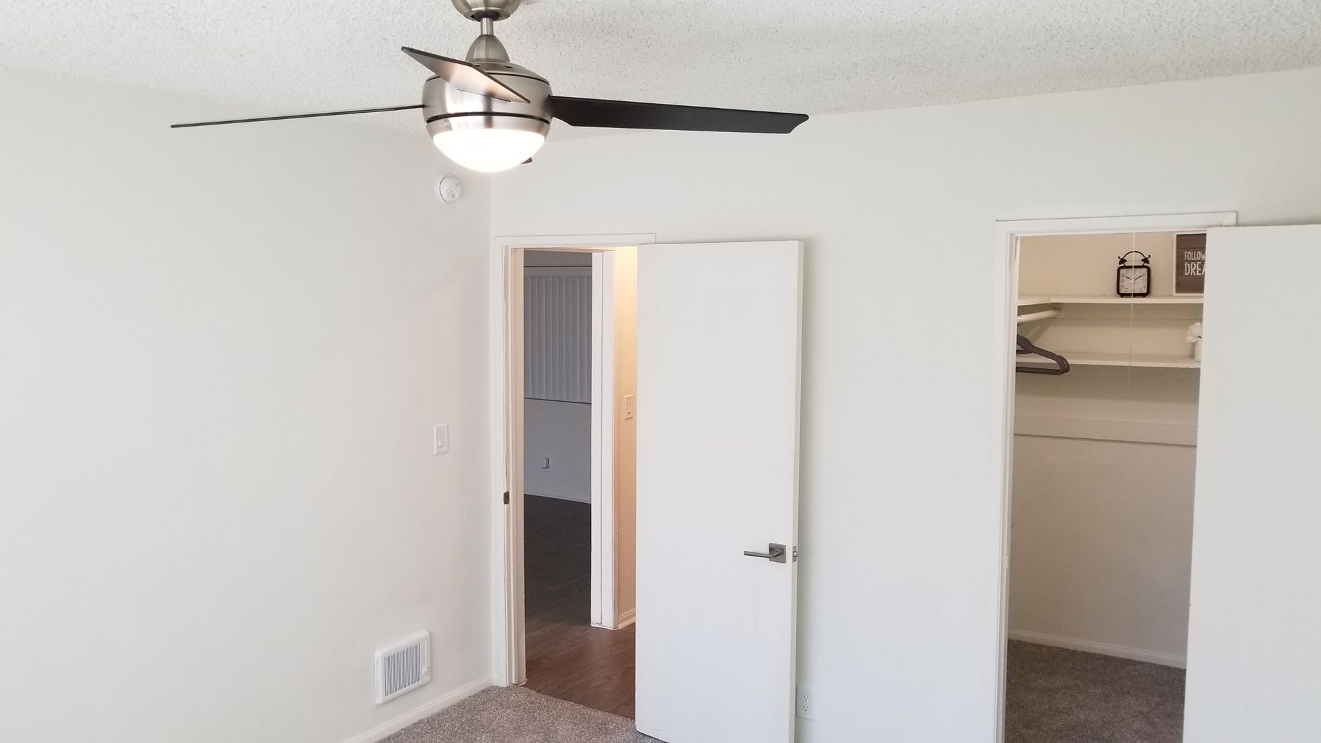 o Spacious bedroom with plush carpeting, ceiling fan, and large walk-in closet